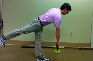 3) Single arm hip hinge: Hold a small weight in your right hand. Stand on your Left leg and bend forward hinging only at the hip. Return to an upright position. Repeat 10 times on each leg.