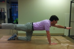 2) Quadraped arm and leg raises: Assume a hands and knees position. Keep your back very flat as you raise one arm and the opposite leg. Hold for 5 seconds and repeat 10 times on each side.